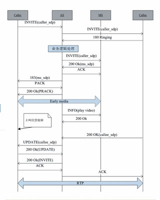 圖3是基于IMS的多媒體彩鈴業(yè)務的信令流程圖,描述了主叫呼叫被叫、被叫空閑、系統(tǒng)向主叫播放視頻的正常流程,需要終端支持100rel擴展。AS采用B2BUA模式,收到主叫UAC發(fā)送的帶主叫SDP的INVITE消息后,AS向被叫UAS發(fā)送帶主叫SDP的INVITE消息,當收到被叫發(fā)送的180Ringing響應后,AS進行業(yè)務邏輯處理,判斷應該向主叫播放什么視頻。接著AS向MS發(fā)送帶主叫SDP的INVITE消息,MS回復帶自身SDP的200Ok響應,AS向主叫回復183 Session Progress 響應,從而在主叫和MS之間建立早期媒體流。AS向MS發(fā)送指示播放視頻的INFO消息,MS直接向主叫播放定制的精彩視頻。當被叫摘機后,AS收到帶被叫SDP的200 Ok響應,通過UPDATE請求消息向主叫發(fā)送被叫的SDP,此時主被叫媒體協(xié)商完成,媒體流重定向到主被叫之間,呼叫雙方進行視頻通話。