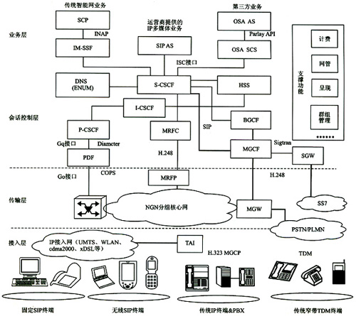 接入層支持各種有線和無線終端。固定和無線SIP終端可通過IP接入網(wǎng)直接鏈入,非SIP終端(如H.323)必須通過TAI(終端適配接口)完成H.323和SIP的轉(zhuǎn)換才能接入IP接入網(wǎng)。各種寬帶IP終端可通過MGW、MGCF、SGW實現(xiàn)與PSTN/PLMN域的傳統(tǒng)窄帶TDM(時分復用)終端實現(xiàn)互通。