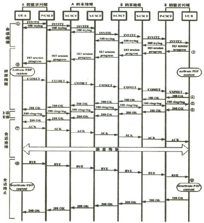 如圖4所示是最普通的兩個漫游用戶的會話建立過程。一個完整的IMS呼叫分為會話邀請、資源預留、會話提供、會話連接、會話終止五個階段。