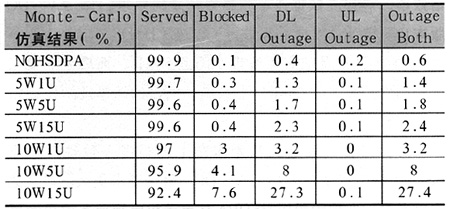 通過表3可以看出,隨著HSDPA功率分配的增加,網絡阻塞率和下行鏈路功率過載隨之增加,特別是功率增加到10W時,增加幅度尤為明顯;在一定的HSDPA功率分配前提下,隨著網內HSDPA用戶數的增加,網絡阻塞率和下行鏈路功率過載隨之增加,特別是用戶數增加到15人時,增加幅度尤為明顯?梢奌SDPA網絡性能在一定程度上受限于HSDPA功率分配和網內HSDPA用戶數。