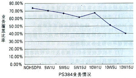 由圖1可知,當HSDPA分配功率為5W時,HSDPA對網絡覆蓋沒有很大影響;當它為10W時,如果HSDPA用戶數不大,影響也有限;但是,當它為10W時,如果HSDPA用戶數持續(xù)增加,則會產生嚴重影響。在下行從NOHSDPA的74%降低到10W15U的40.62%時,PS384業(yè)務降低了近一半。同時,隨著業(yè)務速率的提高,網絡影響越大。另外,在一定的HSDPA功率分配前提下,隨著HSDPA用戶數的增加,過載率增大,網絡中高速數據業(yè)務的比例隨之減少,各點上的用戶速率不斷降低;同時,用戶的增多使得各小區(qū)的HSDPA發(fā)射功率不斷增大,導致區(qū)域中間各點的終端接收功率普遍增加。