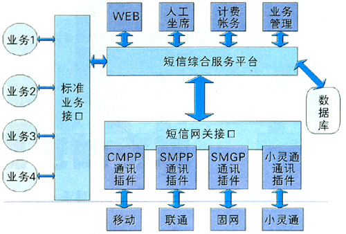 業(yè)務管理平臺是為運營商提供的可快速啟動各種數據業(yè)務的平臺,具有強大的資源調度能力。它連接運營商的基礎網絡和業(yè)務支撐系統(客服系統、計費系統),為服務提供商/內容提供商們提供各種移動資源(如短信息中心資源、用戶信息資源、語音資源等)、功能資源(如單點認證、計費、漫游控制等)及各種公共的資源引擎(如地理位置、語音交互、推送信息等)。業(yè)務支撐系統是運營商為了開展業(yè)務必須建設的客服系統、營業(yè)系統、計費系統等子系統。圖3是目前常用的綜合短信平臺[3]。