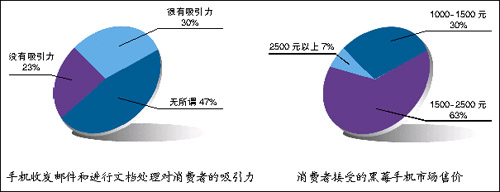 另一個(gè)調(diào)查項(xiàng)目展現(xiàn)了這個(gè)問(wèn)題的另一面。調(diào)查顯示,只有28%的消費(fèi)者知道黑莓手機(jī)的核心功能是郵件的Push功能和在線文件處理。并且,在這些人中,83%的人認(rèn)為這個(gè)功能的收費(fèi)令他們無(wú)法接受。