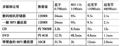 2.0接口相當,遠遠高于無線局域網(wǎng)802.11b的11 Mbit/s,也比下一代無線局域網(wǎng)802.11a/g的54 Mbit/s高出近一個數(shù)量級。UWB通信的功耗較低,能更好地滿足使用電池的移動設備的要求。另外,UWB信號的功率譜密度非常低,信號難以被檢測到,再加上采用的跳頻、直接序列擴頻等擴頻多址技術,使非授權者很難截獲傳輸?shù)男畔,因而安全性非常好。?是一些典型的實時多媒體應用對不同無線傳輸技術的數(shù)據(jù)傳輸速率的要求。從表中可以看出,如果采用無線的方式來進行傳輸,只有UWB技術可以滿足各種應用的要求。