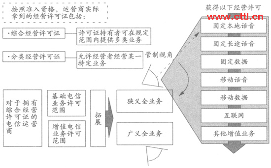 全業(yè)務(wù)可從電信管制、業(yè)務(wù)屬性及市場(chǎng)三個(gè)角度進(jìn)行定義。全業(yè)務(wù)運(yùn)營(yíng)則可以從兩個(gè)角度來看待,一是從管制視角帶來的狹義全業(yè)務(wù);一是從多業(yè)務(wù)領(lǐng)域與電信結(jié)合的廣義全業(yè)務(wù)。具體表述可參照?qǐng)D1。