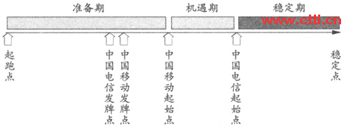 此版本是表示中國(guó)移動(dòng)進(jìn)入3G業(yè)務(wù)運(yùn)營(yíng)早于競(jìng)爭(zhēng)對(duì)手。圖4根據(jù)中國(guó)移動(dòng)和中國(guó)電信發(fā)放牌照的不同時(shí)期而將全業(yè)務(wù)運(yùn)營(yíng)市場(chǎng)策略劃分成準(zhǔn)備期、機(jī)遇期和穩(wěn)定期。