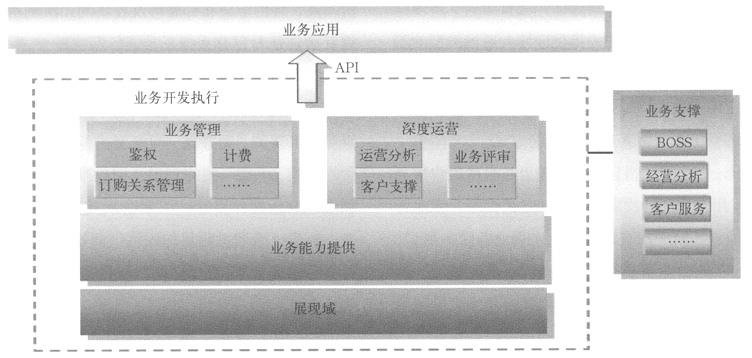 根據(jù)移動增值業(yè)務(wù)特征及業(yè)務(wù)部署、管理需求,目標(biāo)網(wǎng)絡(luò)架構(gòu)中將實現(xiàn)業(yè)務(wù)與控制的分離,劃分業(yè)務(wù)控制域和業(yè)務(wù)開發(fā)執(zhí)行域,并可開放公共接口實現(xiàn)各增值業(yè)務(wù)應(yīng)用無差別的接入、管理及功能調(diào)用,以方便的實現(xiàn)業(yè)務(wù)的融合、業(yè)務(wù)功能的靈活組合,更利于高效、簡便的實現(xiàn)業(yè)務(wù)部署、開發(fā)及運營。