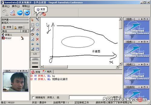 可以看到該系統(tǒng)提供了多路視頻展示與共享文檔顯示區(qū)、文本交流、文檔共享、語音交流等多種交互手段,各用戶可以在主席的協(xié)調(diào)下使用各項功能輕松地實現(xiàn)實時交流與網(wǎng)絡協(xié)作。