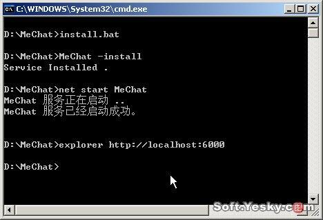 說明:MeChat目錄中還有一個Run、bat,該文件用于測試MeChat服務器。假如安裝MeChat時Run、bat的命令窗口還開著,則務必先關閉此窗口再執(zhí)行install、bat。另外,雙擊執(zhí)行該目錄下的uninstall、bat批處理文件可以停止并刪除系統(tǒng)中的MeChat服務。