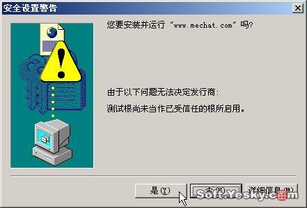 初次進入MeChat聊天室,瀏覽器會彈出如圖25所示的安全設置警告,單擊“是”,然后程序會自動下載安裝MeChat語音與視頻聊天插件。