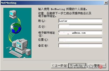 首次運行Netmeeting,軟件會出現(xiàn)一個向?qū)В髮τ脩粜畔⑦M行簡單的設定,單擊下一步,輸入個人信息,如圖4所示: