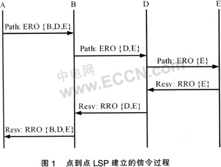 Switching Path)建立的信令過(guò)程。當(dāng)入口標(biāo)記交換路由器(LSR:Label Switching Router)A接收到一個(gè)業(yè)務(wù)請(qǐng)求后,它根據(jù)路由控制模塊計(jì)算出來(lái)的路由填寫(xiě)顯示路由對(duì)象(ERO:Explicit