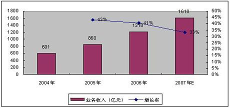 賽迪顧問(wèn)預(yù)測(cè)2007年底,我國(guó)增值電信業(yè)務(wù)市場(chǎng)收入有望超過(guò)1600億元,增速高達(dá)33%,移動(dòng)增值業(yè)務(wù)收入規(guī)模將達(dá)980億元左右,占比高達(dá)61.25%。2007年增值電信業(yè)務(wù)經(jīng)營(yíng)企業(yè)的數(shù)量將會(huì)出現(xiàn)負(fù)增長(zhǎng),量的下降帶來(lái)質(zhì)的提升,表明增值電信業(yè)市場(chǎng)已經(jīng)趨于良性發(fā)展。