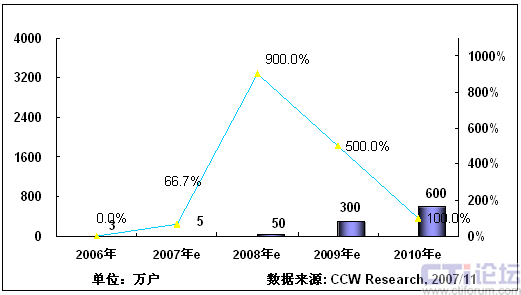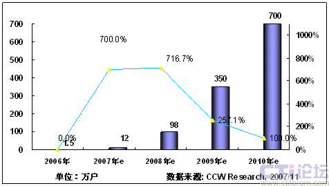 2008年,隨著3G在中國商用,以及奧運(yùn)帶來豐富視頻內(nèi)容,將推動(dòng)手機(jī)電視作為一項(xiàng)重要的移動(dòng)增值業(yè)務(wù)將進(jìn)入市場(chǎng)發(fā)展期;同時(shí)隨著網(wǎng)絡(luò)、終端、內(nèi)容、商業(yè)模式等因素的發(fā)展,產(chǎn)業(yè)鏈初步完善,看好手機(jī)電視業(yè)務(wù)的產(chǎn)業(yè)鏈各環(huán)節(jié)大力介入,北京奧運(yùn)會(huì)將大大激發(fā)用戶使用手機(jī)電視業(yè)務(wù)的熱情,從而推動(dòng)手機(jī)電視進(jìn)入快速發(fā)展階段。根據(jù)計(jì)世資訊預(yù)計(jì),2008年中國手機(jī)電視用戶將達(dá)到400萬。