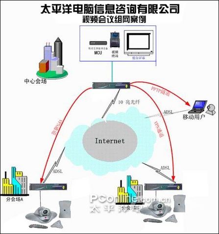 該方案有很強(qiáng)的針對(duì)性,作為主會(huì)場(chǎng)必須用10兆/20兆光纖接入INTERNET,且需要視頻交換處理設(shè)備MCU,而太平洋電腦網(wǎng)本身就具備雄厚的服務(wù)器作為基礎(chǔ)。廣州總公司還需要較高配置的視頻終端設(shè)備,在局域網(wǎng)網(wǎng)關(guān)上安裝較高配置路由器,主會(huì)場(chǎng)可以通過設(shè)置MCU隨時(shí)使某一分會(huì)場(chǎng)成為主席。