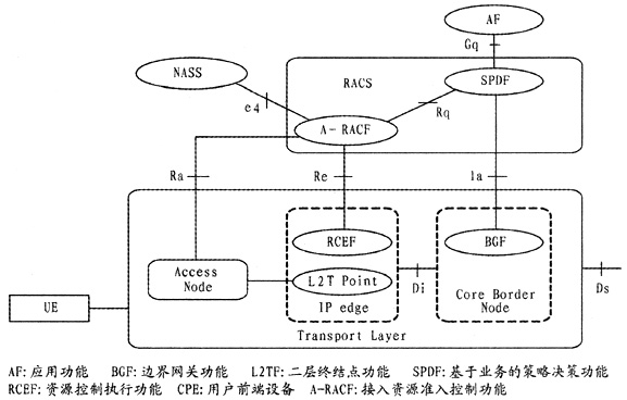 RACS是NGN的組成部分之一,將業(yè)務層的資源需求與網絡承載層的資源分配相關聯,主要完成策略控制、資源預留、接納控制、網絡地址轉換(NAT)和防火墻穿越等功能。RACS通過一系列策略為應用提供基于傳輸的控制服務,只要該應用支持RACS接口,RACS就能保證任意應用能夠請求到與其服務相匹配的傳輸資源。同時,RACS為運營商提供多種不同接納控制的方法,并設置各自的承載服務策略。RACS為各種服務提供獲得網絡資源的方法,使得用戶終端可以獲得所提供服務,其總體功能結構如圖3所示[5]。