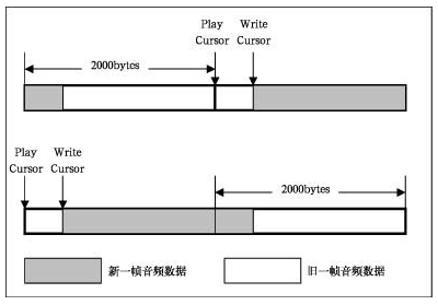 從理論上講,這已經(jīng)保證了音頻回放的流暢性。但在實(shí)現(xiàn)過程中,由于操作的對象是一幀的音頻數(shù)據(jù),其回放的時(shí)間僅是0.25秒,所以必須考慮的一個(gè)問題是程序的反應(yīng)速度問題。如果忽略由事件觸發(fā)到真正用Lock函數(shù)鎖定緩沖區(qū)的部分以進(jìn)行新數(shù)據(jù)寫入之間的時(shí)間,則這種實(shí)現(xiàn)方法沒有任何問題。除了最開始的兩幀數(shù)據(jù)外,新的一幀數(shù)據(jù)會(huì)緊跟在前一幀數(shù)據(jù)之后,彼此之間沒有重疊部分,也沒有空隙存在,能很好地達(dá)到音頻回放的流暢效果。但事實(shí)上,由事件觸發(fā)到真正用Lock函數(shù)鎖定緩沖區(qū)的部分以進(jìn)行新數(shù)據(jù)的寫入之間還必須經(jīng)過線程監(jiān)聽到事件,分析事件對應(yīng)的緩沖區(qū),然后再觸發(fā)相應(yīng)的回調(diào)函數(shù)來進(jìn)行