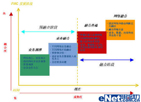 融合階段是指通過多模終端實現(xiàn)不同網絡接入層的融合,以及運營商通過建立統(tǒng)一的核心承載網來實現(xiàn)固定網絡和移動網絡的真正融合。在該階段,運營商的FMC業(yè)務將從原來的簡單語音服務和數據接入服務,轉變?yōu)榛跀祿膬热菰鲋禈I(yè)務,以及多向的應用業(yè)務。
