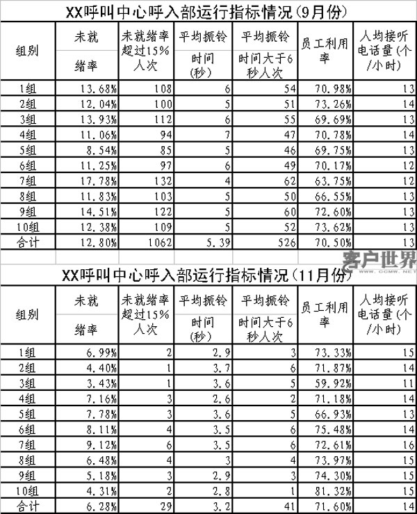 筆者所在呼叫中心從今年10月份開始實行“四率管理”,以解決現(xiàn)場管理工作的存在的問題,提高現(xiàn)場管理水平,提高服務(wù)效率。從統(tǒng)計數(shù)據(jù)看(見下表),實行“四率管理”后,呼叫中心的現(xiàn)場管理水平得到大幅提高,服務(wù)指標(biāo)增長較快。在員工利用率基本保持不變的情況下,未就緒率、平均振鈴時間、每小時接聽電話量等指標(biāo)均得到有效改善。其中,未就緒率從9月份的12.8%降低到6.3%,未就緒率低于15%的員工人次從1062次降低到29次;平均振鈴時間從5.4秒降低到3.2秒,平均振鈴時間大于6秒的人次從526人次降低到41人次。每小時人均接聽電話數(shù)量從13個提高到14個。按8小時工作計算,每人每天接聽電話數(shù)量增長10個左右。具體統(tǒng)計數(shù)據(jù)見下表。