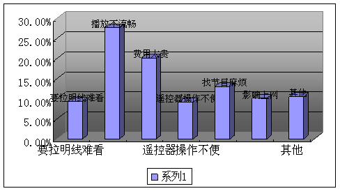 A、要拉明線難看(9.33%) B、播放不流暢(27.63%) C、費用太貴(20.18%) D、遙控器操作不便(9.16%)