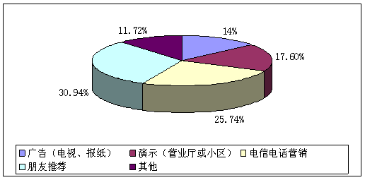 A、廣告(電視、報紙)(14%) B、演示(營業(yè)廳或小區(qū))(17.6%) C、電信電話營銷(25.74%) D、朋友推薦(30.94%)