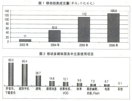日本的在線購(gòu)物和拍賣(mài)市場(chǎng)起步較晚,但發(fā)展速度較快,用戶(hù)的認(rèn)知度也比較高,有41%~48%的移動(dòng)互聯(lián)網(wǎng)用戶(hù)使用過(guò)該項(xiàng)業(yè)務(wù)。十幾歲到二十幾歲的女性較傾向于使用該業(yè)務(wù)。2006年移動(dòng)拍賣(mài)的成交量為1295億日元,占到了通過(guò)手機(jī)在線購(gòu)買(mǎi)成交量的1/2(見(jiàn)圖1)。
