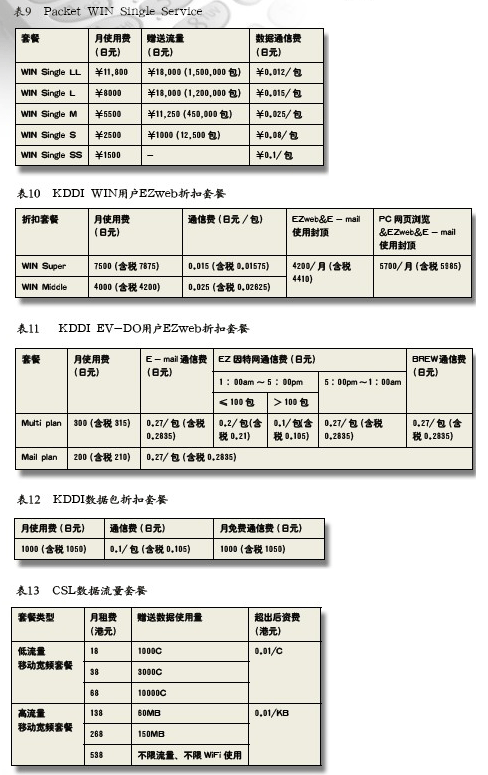 用戶使用WIN au手機(jī),通信包標(biāo)準(zhǔn)計費為0.1日元/包(Packet)(含稅0.105日元),其中1Packe=128Bytes。KDDI為用戶提供分檔包月套餐,見表9。