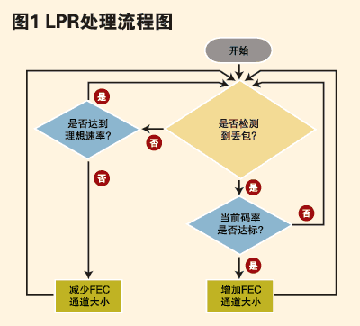 不同于大多數(shù)差錯隱消或規(guī)避算法只介入接收丟包信息系統(tǒng)的方式,LPR會介入到視頻通話中的各級系統(tǒng)中,通過臨時將一部分通話帶寬分配給一個數(shù)據(jù)通道,從而用于發(fā)送FEC數(shù)據(jù)給接收系統(tǒng)來發(fā)揮作用。在網(wǎng)絡(luò)傳輸發(fā)生丟包時,通過上述的一個循環(huán)處理,LPR就會增加或減少FEC數(shù)據(jù)通道的大小,直到找到必須分配給FEC數(shù)據(jù)通道的最小帶寬,從而使得接收系統(tǒng)能夠恢復(fù)所有丟失的數(shù)據(jù)包。