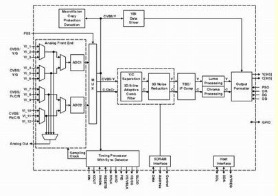 圖2所示為視頻解碼器的數(shù)據(jù)流路徑,它負(fù)責(zé)處理NTSC、PAL、SECAM、S-Video、SCART、YPbPr、RGB、480p和其它輸入格式。在數(shù)字電視中,對(duì)這種級(jí)別的靈活性的支持是必需的,完全是為了讓一個(gè)機(jī)型經(jīng)過(guò)實(shí)際設(shè)置可以工作于任何格式。數(shù)字電視解碼器的典型性能特征包括:同步、消隱、場(chǎng)、有源視頻窗口、水平和垂直同步、時(shí)鐘、同步鎖相(用于下行視頻編碼同步)、主CPU中斷和可編程邏輯I/O信號(hào)。這是對(duì)數(shù)字視頻輸出以及用于先進(jìn)的垂直消隱期(VBI)數(shù)據(jù)恢復(fù)的補(bǔ)充。作為一種附加功能,一些視頻解碼器支持VBI數(shù)據(jù)處理器(VDP)在文字電視廣播、傳送字幕(CC)和其它VBI數(shù)據(jù)上進(jìn)行數(shù)據(jù)分片、解析和執(zhí)行誤碼校驗(yàn)。內(nèi)置的FIFO存儲(chǔ)多達(dá)11行文字電視廣播數(shù)據(jù),而適當(dāng)?shù)闹鹘涌谕郊叭聊晃淖蛛娨晱V播恢復(fù)是當(dāng)今系統(tǒng)中的幾個(gè)常見(jiàn)要求。然而,一些實(shí)現(xiàn)方案需要一種解碼器,它能夠?yàn)榛谥鰿PU的VBI處理提供速度為已采樣原始亮度數(shù)據(jù)兩倍的輸出格式化數(shù)據(jù)。