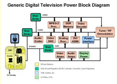 在電視中的大多數(shù)功能模塊中,包括為數(shù)字電視本身創(chuàng)建主電源的AC/DC轉(zhuǎn)換器,都需要一種特別的電源方案,如用于DLP燈、LCD偏置、或顯示器的背光電源、主處理器的核及I/O、DDR存儲(chǔ)器以及用于調(diào)諧器和視頻/模擬信號(hào)鏈的電源。圖4所示為數(shù)字電視的基本電源分配流程。