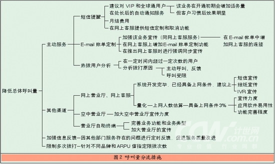 在給某移動(dòng)運(yùn)營商進(jìn)行的接通率優(yōu)化咨詢項(xiàng)目中,利用呼叫中心接通率優(yōu)化模型進(jìn)行了分析,圖2是針對分流呼叫中心總體呼叫量所提出的建議措施。