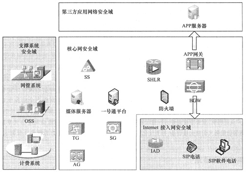 核心網(wǎng)安全域包括所有的軟交換機(jī),TG、AG、SG等接入網(wǎng)關(guān),BGW類(lèi)設(shè)備,關(guān)鍵業(yè)務(wù)平臺(tái)(包括SHLR、號(hào)碼轉(zhuǎn)換平臺(tái)等),軟交換媒體服務(wù)器和應(yīng)用服務(wù)器,開(kāi)發(fā)給第三方業(yè)務(wù)接口的應(yīng)用網(wǎng)關(guān)。Internet接入網(wǎng)安全域包括所有分配公網(wǎng)地址的SIP電話終端、IAD類(lèi)設(shè)備、各類(lèi)SIP接入的PC等。支撐系統(tǒng)安全域包括網(wǎng)管、計(jì)費(fèi)和OSS等輔助運(yùn)營(yíng)系統(tǒng)。第三方應(yīng)用網(wǎng)絡(luò)安全域主要包括所有以開(kāi)發(fā)業(yè)務(wù)接口方式接入的應(yīng)用服務(wù)器,鑒于目前實(shí)際應(yīng)用中很少涉及到這種應(yīng)用,這里不討論該區(qū)域的安全需求。