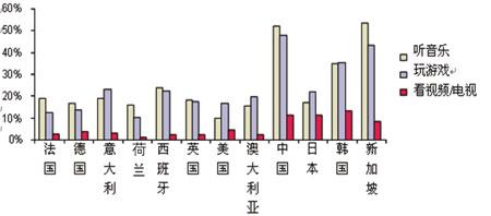 除打電話、發(fā)短信、拍照、手機郵箱以外,音樂、游戲也是用戶每周使用較多的業(yè)務(wù)。當(dāng)被問及其它應(yīng)用時,來自中國、新加坡還有韓國的部分被調(diào)查者表示,他們會經(jīng)常用手機來聽音樂和玩游戲。其中,中國是惟一一個選擇用手機聽音樂的用戶數(shù)與選擇用手機拍照的用戶數(shù)旗鼓相當(dāng)?shù)膰。但有趣的是,手機在中國不太可能成為MP3的替代品,仍然只是一個便攜播放器。在新加坡,手機替代MP3的可能性就大多了。Ovum認(rèn)為,這是由于高端手機在新加坡市場占有很高的比例。在歐洲和美國,使用手機來聽音樂和玩游戲的比例則比亞洲少了很多,但值得鼓勵的是仍有超過10%的被調(diào)查者選擇了該答案。(見圖2)