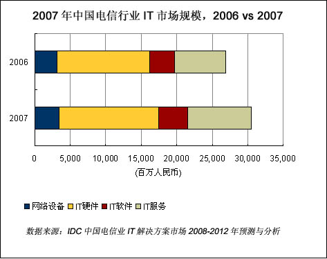 IDC《中國電信行業(yè)IT解決方案市場2008-2012年預(yù)測與分析》報(bào)告的數(shù)據(jù)顯示,2007年中國電信行業(yè)整體IT支出規(guī)模為305.02億元人民幣,比2006年增長了13.2%。2007年電信行業(yè)IT運(yùn)營支撐系統(tǒng)和增值業(yè)務(wù)系統(tǒng)的高速增長主要是由于運(yùn)營商都在為3G的實(shí)施和全業(yè)務(wù)運(yùn)營做準(zhǔn)備。