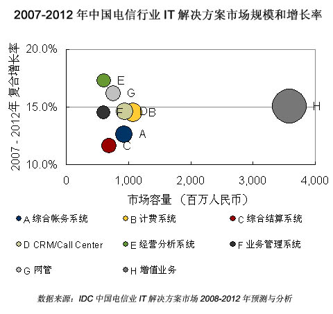 IDC預(yù)計(jì),2007-2012年電信行業(yè)將注重運(yùn)營支撐系統(tǒng)的全業(yè)務(wù)運(yùn)營整合和支持前端業(yè)務(wù),因此3G增值業(yè)務(wù)、經(jīng)營分析系統(tǒng)、客戶關(guān)系管理系統(tǒng)、IT服務(wù)管理系統(tǒng)等建設(shè)將實(shí)現(xiàn)快速增長。已有項(xiàng)目仍然會(huì)持續(xù)升級(jí)維護(hù),以及配合全業(yè)務(wù)運(yùn)營作出功能上的提升。2007年電信IT應(yīng)用解決方案(僅含解決方案供應(yīng)商自有軟件及其相關(guān)服務(wù)包括BSS/OSS/MSS/VAS)市場規(guī)模為97.27億元人民幣,占整體電信軟件和服務(wù)市場容量的74.5%。2012年電信行業(yè)IT解決方案整體市場規(guī)模將達(dá)到193.5億元人民幣。