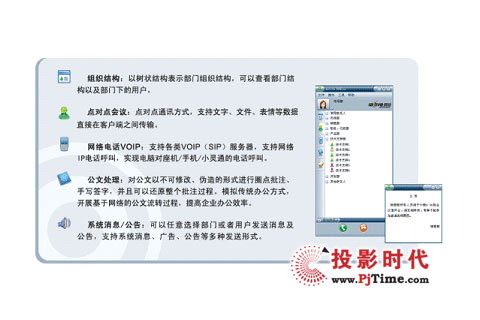 Center運營架構(gòu)為基礎(chǔ),有效整合了企業(yè)的如電話、傳真、手機(jī)、短信、E-mail、即時通訊等各種常用的通信設(shè)備和媒體應(yīng)用,并進(jìn)行統(tǒng)一管理、計劃及協(xié)同,是一套集即時通訊、網(wǎng)絡(luò)電話、點對點會議、多方視頻會議、遠(yuǎn)程教學(xué)、遠(yuǎn)程監(jiān)控、組織結(jié)構(gòu)等為一體的桌面融合辦公系統(tǒng),能夠全面滿足企業(yè)遠(yuǎn)程的日常交流、會議培訓(xùn)、協(xié)同辦公、商務(wù)談判、指揮調(diào)度、安全保衛(wèi)等各種需求。
