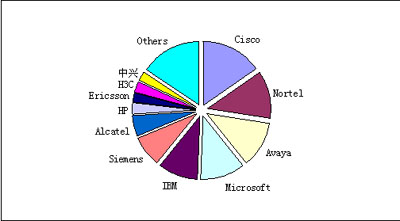 各大通信與IT廠商都在厲兵秣馬,充分挖掘企業(yè)的自身優(yōu)勢,準(zhǔn)備在潛力巨大的統(tǒng)一通信市場中取得良好戰(zhàn)績。賽迪顧問數(shù)據(jù)顯示,2008年上半年,中國統(tǒng)一通信市場中,Cisco公司以15.3%的市場份額繼續(xù)保持領(lǐng)頭樣的位置,在通信設(shè)備領(lǐng)域,Nortel和Avaya分別以12.1%和11.7%的市場份額緊隨其后。值得一提的是Microsoft和IBM以其在全球獨(dú)一無二的終端用戶,迅速占領(lǐng)統(tǒng)一通信軟件市場,無論是市場份額還是整體競爭力都成績不俗,且增長勢頭強(qiáng)勁。各大廠商短時間的涌入,使得統(tǒng)一通信市場出現(xiàn)了前所未有的群雄逐鹿的局面,競爭異常激烈。