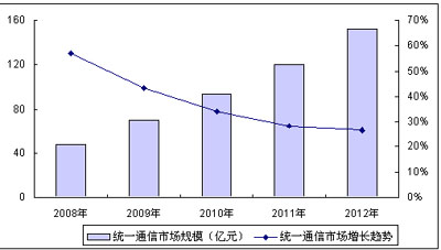 統(tǒng)一通信作為一種以融合技術(shù)為基本特征的特定解決方案和應(yīng)用,通過對各種溝通方式進(jìn)行有效的融合,滿足用戶方便快捷的信息獲取和溝通需求,近年來在全球范圍內(nèi)得到了迅猛發(fā)展,各大通信與信息技術(shù)相關(guān)廠商紛紛加入統(tǒng)一通信市場的競爭中。賽迪顧問數(shù)據(jù)統(tǒng)計(jì)顯示,2008年上半年,中國統(tǒng)一通信整體市場規(guī)模已達(dá)到21.01億元,同比增長超過60.9%,繼續(xù)保持強(qiáng)勁的增長勢頭。