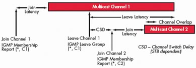 TV節(jié)目通常采用組播方式進行傳送。組播是一種允許一個或多個發(fā)送者(組播源)一次同時發(fā)送單一的數(shù)據(jù)包到多個接收者的網(wǎng)絡技術。組播源把數(shù)據(jù)包發(fā)送到特定組播組,而只有屬于該組播組的地址才能接收到數(shù)據(jù)包。在IPTV里,組播源往往僅有一個,即使用戶數(shù)量成倍增長,主干帶寬也不需隨之增加,因為無論有多少個目標地址,在整個網(wǎng)絡的任何一條主干鏈路上只傳送單一視頻流,即所謂“一次發(fā)送,組內廣播”。組播提高了數(shù)據(jù)傳送效率,減少了主干網(wǎng)出現(xiàn)擁塞的可能性。對于TV系統(tǒng)而言,其所能夠支持的用戶數(shù)目僅僅受到接入網(wǎng)絡能力的限制,與前端推送系統(tǒng)的推送能力無關。因此,TV業(yè)務性能的主要測試指標包括所推送的最大頻道數(shù)目、頻道平均帶寬、平均頻道切換時間、I幀加入延時、平均頻道離開延時、平均頻道加入延時、頻道重疊時間和頻道間隔時間。