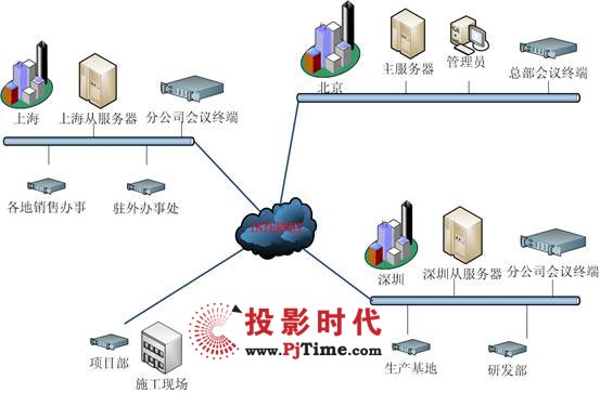 3臺高端專用服務(wù)器作為視頻會議服務(wù)器,可容納多點(diǎn)同時開會,以確保系統(tǒng)的穩(wěn)定性和性能要求。主服務(wù)器放置在總公司,從服務(wù)器共2個,分別放置在輻射分公司面大,位于分公司中心的兩個城市。所有接入的服務(wù)器和客戶端采用同一網(wǎng)絡(luò)服務(wù)商的線路。配置了使用1000M服務(wù)器專用網(wǎng)卡,以保證正常的音視頻信號的傳輸。并且將服務(wù)器放置在主干/核心交換機(jī)上,使服務(wù)器和客戶端的路由/交換性能達(dá)到最佳效果。其網(wǎng)絡(luò)拓?fù)鋱D如下: