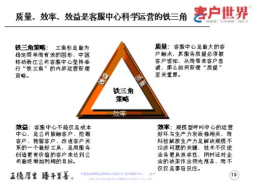 應(yīng)該說這三個(gè)方面是科學(xué)運(yùn)營的一個(gè)鐵三角,這是我們的理解,因?yàn)槿切,始終認(rèn)為是最穩(wěn)定、簡(jiǎn)單、有效的圖形,也是我們?cè)谶M(jìn)行內(nèi)部運(yùn)營的管理鐵架。質(zhì)量是客服中心最大的觸點(diǎn)當(dāng)中被客戶感知,從而帶來客戶忠誠的,如何管理質(zhì)量,那就至關(guān)重要。效率尤其是規(guī)模型的呼叫中心的運(yùn)營好壞,是與生產(chǎn)力的發(fā)展強(qiáng)相關(guān),而科技解放生產(chǎn)力是解決規(guī)模問題的關(guān)鍵。技術(shù)不僅是運(yùn)行更具效益率,同時(shí)還對(duì)企業(yè)的決策作出預(yù)先準(zhǔn)備,而不僅僅是事后反應(yīng)。很多年來,更多的企業(yè)是把客服中心視為成本中心,而事實(shí)上,效益的顯現(xiàn)讓我們陸續(xù)地走出了成本中心,它應(yīng)該是公司接觸客戶、挖掘客戶、挽留客戶、改進(jìn)客戶關(guān)系的一個(gè)最好工具,是用服務(wù)創(chuàng)造更有價(jià)值的客戶,來達(dá)到公司最終增加利潤的目標(biāo)。