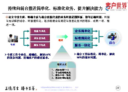 設(shè)立專線專席,并不是指專線越專越多,而是持續(xù)地向前臺(tái)推送簡(jiǎn)單化、標(biāo)準(zhǔn)化的業(yè)務(wù),提升前臺(tái)一線的解決能力,所以我們重點(diǎn)以專線的技能專業(yè)化、業(yè)務(wù)復(fù)雜化、服務(wù)個(gè)性化,然后把簡(jiǎn)單的形成規(guī)范標(biāo)準(zhǔn)的業(yè)務(wù)向前臺(tái)推送,保障專席的工作是專業(yè)化、精確化地解決10%的復(fù)雜問題,從而更多地去挖掘客戶的需求。而前臺(tái)客服的工作是用標(biāo)準(zhǔn)化、簡(jiǎn)單化地解決90%的基本問題。