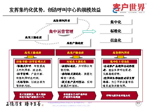 作為集中管理來講,突出“三高”,運(yùn)用好“三高”體現(xiàn)的是如何進(jìn)行集中化、標(biāo)準(zhǔn)化和信息化。我們從高員工滿意度,高客戶滿意度和高資源利用率入手,高員工滿意度主要是應(yīng)用平臺(tái)和科學(xué)的管理方法,使得員工的技能持續(xù)提升,員工的自身收入也按單位時(shí)間而增長;高客戶滿意度是用標(biāo)準(zhǔn)化和規(guī)范化來進(jìn)一步優(yōu)化流程,改進(jìn)操作,對(duì)于目標(biāo)客戶及時(shí)回訪,有效地延長公司產(chǎn)品的客戶使用生命周期,以創(chuàng)造公司的最大利益;作為集中化的呼叫中心,系統(tǒng)已經(jīng)投入了較大的座席規(guī)模,高資源利用率是如何把這些座席和系統(tǒng)的規(guī)模應(yīng)用得更好,使得我們的產(chǎn)品能夠進(jìn)一步地推向市場(chǎng),被客戶所接受,所以我們采取了更多的整合呼出渠道,精確營銷,尤其對(duì)公司的存量客戶進(jìn)行持續(xù)維系的關(guān)鍵時(shí)刻,達(dá)到營銷與服務(wù)效率的最大化。