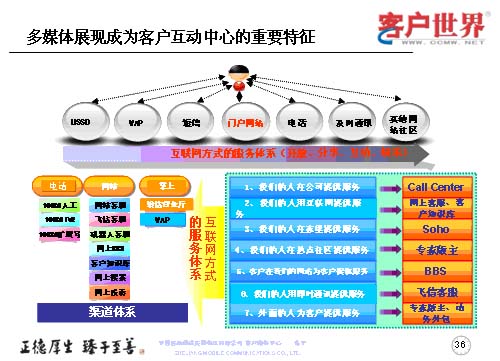 中國移動(dòng)集團(tuán)的呼叫中心大會(huì)已經(jīng)提出了多媒體呼叫中心模型,對(duì)于多媒體展現(xiàn)是成為客戶互動(dòng)中心的重要特征,是基于更多的觸點(diǎn),也就是說基于更多的多媒體觸點(diǎn),以互聯(lián)網(wǎng)的方式來建立服務(wù)體系的開放、分享、互動(dòng)和娛樂。