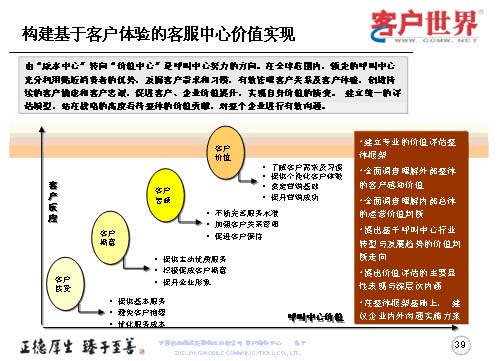 從客戶接受到客戶滿意、客戶忠誠和客戶價(jià)值提升,建立統(tǒng)一的評(píng)估模型,站在戰(zhàn)略的高度來看待整體的客服中心價(jià)值貢獻(xiàn),對(duì)企業(yè)進(jìn)行有效的溝通。這就是說我們建立的是專業(yè)的價(jià)值評(píng)估整體框架,全面調(diào)查、理解外部的客戶感知價(jià)值,全面調(diào)查理解內(nèi)部的運(yùn)營價(jià)值來判斷,提出基于呼叫中心行業(yè)轉(zhuǎn)型與發(fā)展趨勢(shì)的價(jià)值判斷走向,提升價(jià)值評(píng)估的主要顯性表現(xiàn)與深層次內(nèi)涵,在整體框架基礎(chǔ)上,建立企業(yè)內(nèi)外溝通的實(shí)施方案。