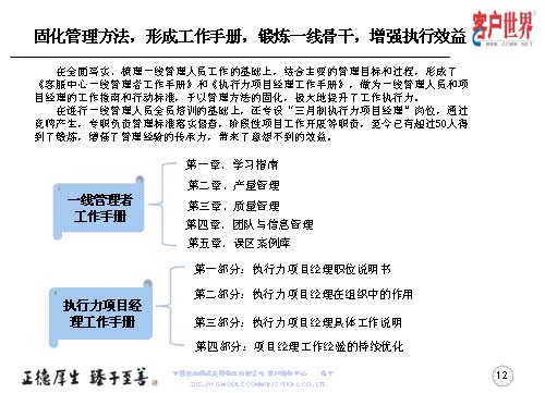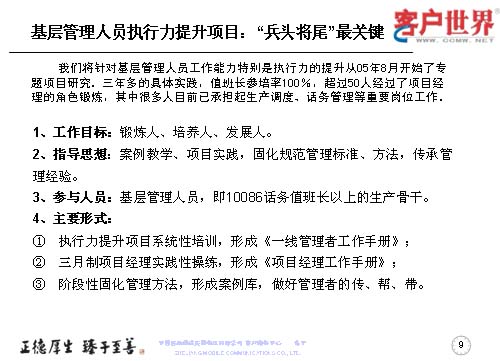 大家知道基層管理人員其實(shí)是兵頭將尾的最關(guān)鍵,我們將對(duì)基層管理人員的工作能力,特別是執(zhí)行力的提升是從05年8月份就開始了專項(xiàng)研究,三年多的具體實(shí)踐,值班長的培訓(xùn)率達(dá)到100%,超過50人經(jīng)過了項(xiàng)目經(jīng)理的角色鍛煉,目前很多擔(dān)任過項(xiàng)目經(jīng)理的已經(jīng)承擔(dān)了生產(chǎn)調(diào)度、話務(wù)管理等重要的管理崗位。在這個(gè)項(xiàng)目當(dāng)中,我們從四個(gè)方面入手,工作目標(biāo)是鍛煉人、培養(yǎng)人、發(fā)展人。指導(dǎo)思想是案例教育、項(xiàng)目實(shí)踐,固化規(guī)范管理標(biāo)準(zhǔn)、方法,傳承管理經(jīng)驗(yàn)。參與人員就是基層管理人員,話務(wù)值班長以上的生產(chǎn)骨干。我們主要運(yùn)用的形式是執(zhí)行力提升項(xiàng)目系統(tǒng)培訓(xùn),形成了《一線管理者工作手冊(cè)》。三月制項(xiàng)目經(jīng)理的實(shí)踐操練,通過競(jìng)聘的方式產(chǎn)生,形成了《項(xiàng)目經(jīng)理工作手冊(cè)》。階段性的固化-優(yōu)化-再固化的管理方法,形成案例庫,做好管理者的傳幫帶。