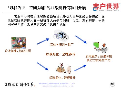 這個(gè)管理咨詢項(xiàng)目開展中,是以我為主,咨詢?yōu)檩o的非常規(guī)咨詢項(xiàng)目,打破的是以外腦為主的常規(guī)運(yùn)作模式,在項(xiàng)目初期就有大量的一線管理人員參與調(diào)研、討論、案例制作、手冊(cè)編制,是名副其實(shí)的“我要”項(xiàng)目。那么在這個(gè)方面我們分成了三部曲,設(shè)計(jì)標(biāo)準(zhǔn)、達(dá)成共識(shí),通過實(shí)驗(yàn)加培訓(xùn)推廣,以我為主的全程參與,來固化經(jīng)驗(yàn),提升管理。最后成果展示,效果體現(xiàn)于執(zhí)行力,彰顯出生產(chǎn)力。