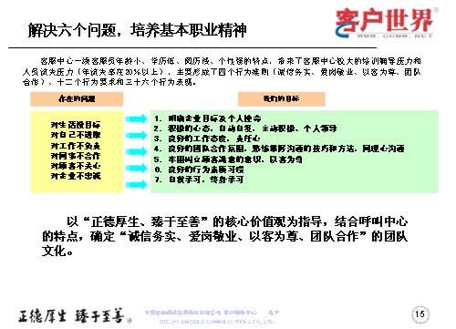 一線客服人員如何來全面提升職業(yè)能力,首先是解決一線客服人員的六個(gè)問題,剛才已經(jīng)跟大家交流了客服中心一線人員的人員結(jié)構(gòu),當(dāng)前的六個(gè)主要問題可以用簡(jiǎn)單的幾個(gè)方面來表述:對(duì)生活沒有明確的目標(biāo)、對(duì)自己不進(jìn)取、對(duì)工作不負(fù)責(zé)、對(duì)同事不合作、對(duì)顧客不關(guān)心、對(duì)企業(yè)不忠誠,這是在日常工作中,一線人員所存在的問題。而針對(duì)這些問題,我們要用工作目標(biāo)去持續(xù)解決和克服問題,所以我們采取的是讓大家明確企業(yè)目標(biāo)與個(gè)人使命,用積極的心態(tài)自主自發(fā),主動(dòng)積極和個(gè)人領(lǐng)導(dǎo);良好的工作態(tài)度責(zé)任心,良好的團(tuán)隊(duì)合作氛圍;熟練掌握溝通技巧和方法,牢固樹立顧客滿意的意識(shí),以客為尊;良好的行為素質(zhì)習(xí)慣,自我學(xué)習(xí),終身學(xué)習(xí)。從而在中國移動(dòng)集團(tuán)“正德厚生、臻于至善”的核心價(jià)值觀指導(dǎo)下,結(jié)合呼叫中心特點(diǎn),確定誠實(shí)務(wù)信,愛崗敬業(yè),以客為尊、團(tuán)隊(duì)合作的團(tuán)隊(duì)文化。