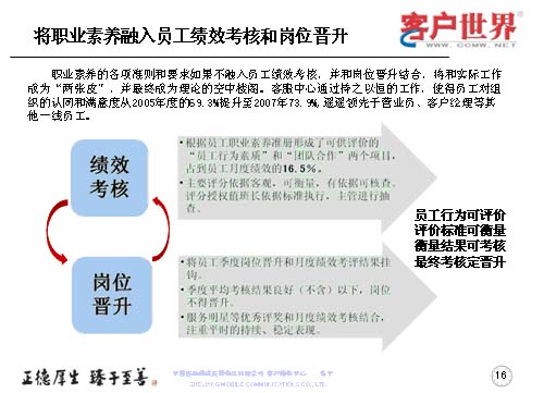 職業(yè)素養(yǎng)不是說在嘴上,講在課上,而是更多地融入到員工的績(jī)效考核于崗位晉升當(dāng)中。以解決工作素養(yǎng)要求和實(shí)際工作的兩張皮,以及使得客服理念成為理論的空中樓閣。所以我們是持之以恒地開展一線員工組織認(rèn)同滿意度調(diào)查,我們每年都會(huì)做一線客服人員的滿意度調(diào)查,在滿意度調(diào)查當(dāng)中,從05年的69.3%,提升到07年的73.9%,而且遙遙領(lǐng)先于營業(yè)員和客服經(jīng)理。而在績(jī)效考核中主要把員工行為素質(zhì)、團(tuán)隊(duì)合作占到了員工月度績(jī)效的16.5%,使大家認(rèn)識(shí)到作為一個(gè)組織中的一員,作為團(tuán)隊(duì)我們是為了一個(gè)共同的目標(biāo),彼此依賴、彼此信任,同時(shí)也要強(qiáng)化績(jī)效來管理。所以主要的評(píng)分依據(jù)是客觀、可衡量、有依據(jù)可查,同時(shí)也把這些也作為客服人員季度晉升和月度績(jī)效考評(píng)掛鉤,如果該員工季度的平均考核在良好以下的話,將得不到晉升,最終實(shí)現(xiàn)的是員工行為可評(píng)價(jià),評(píng)價(jià)標(biāo)準(zhǔn)可衡量,衡量結(jié)果可考核,最終考核定晉升。