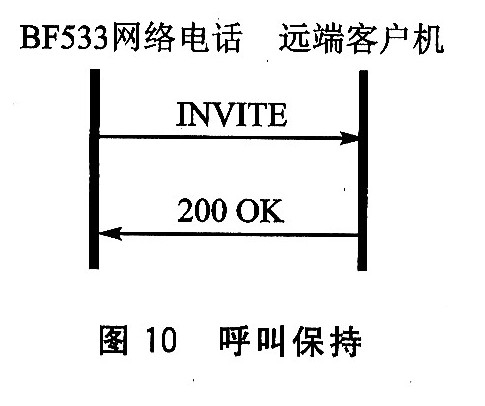 BF533網(wǎng)絡(luò)電話遠(yuǎn)端客戶(hù)機(jī)遠(yuǎn)端各尸機(jī)回復(fù)200 0K接受保持,如圖10所示。同理,呼叫恢復(fù)就是將c參數(shù)恢復(fù)原值,過(guò)程與呼叫保持相同。